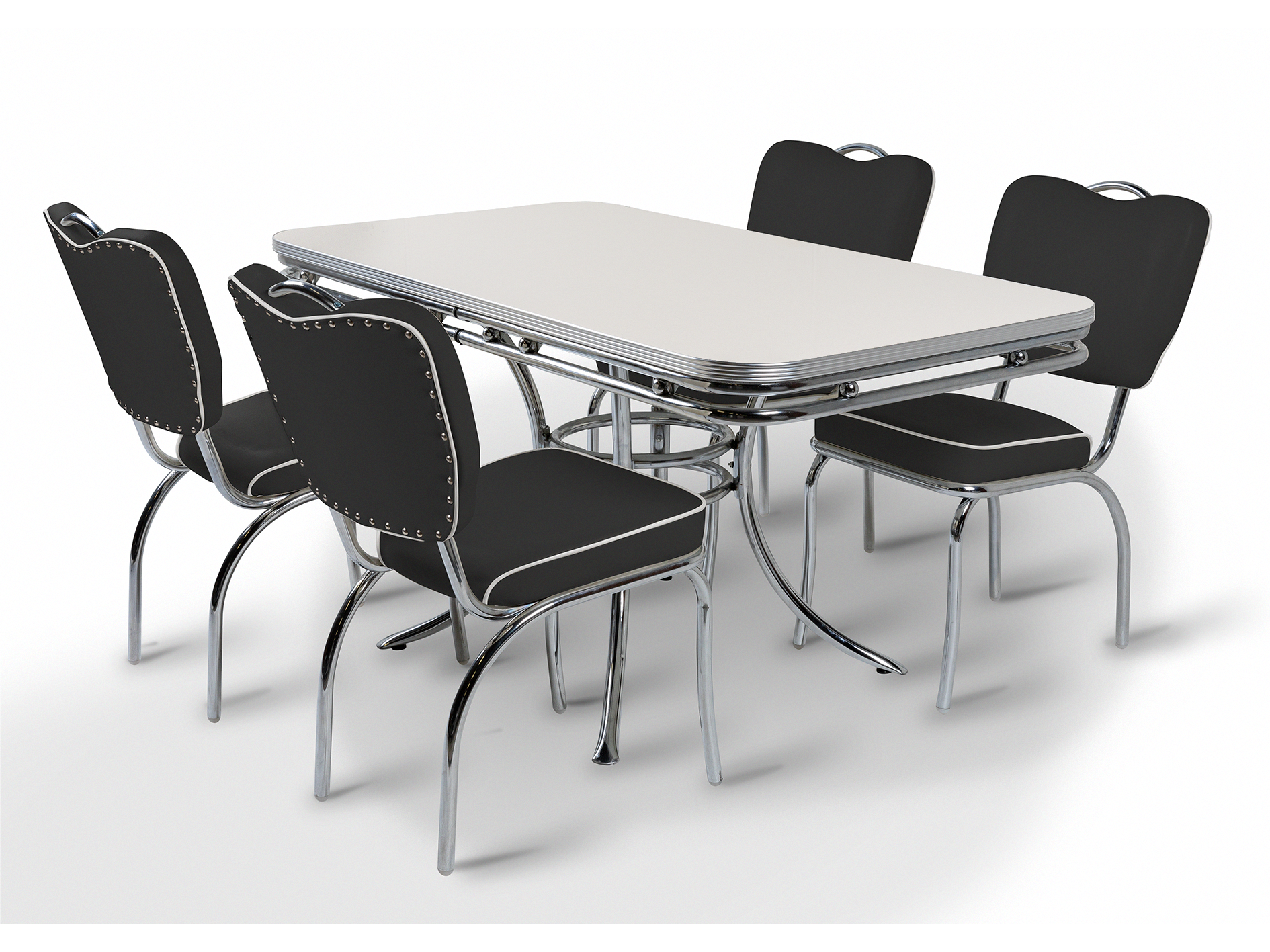 L'ensemble Majestic Black Stone recrée l'ambiance d'un diner américain des années 50 avec un style audacieux et contrasté. Les quatre chaises Majestic, ornées de passepoils blancs et de chrome, allient confort et style vintage affirmé. Chaque chaise est dotée d'une structure chromée fabriquée à la main, de coussins moelleux et d'un dossier papillon offrant un excellent maintien, le tout rehaussé d'un passepoil blanc emblématique. Conçues pour un usage quotidien, elles offrent une assise stable et confortable, idéale pour les intérieurs résidentiels et professionnels.