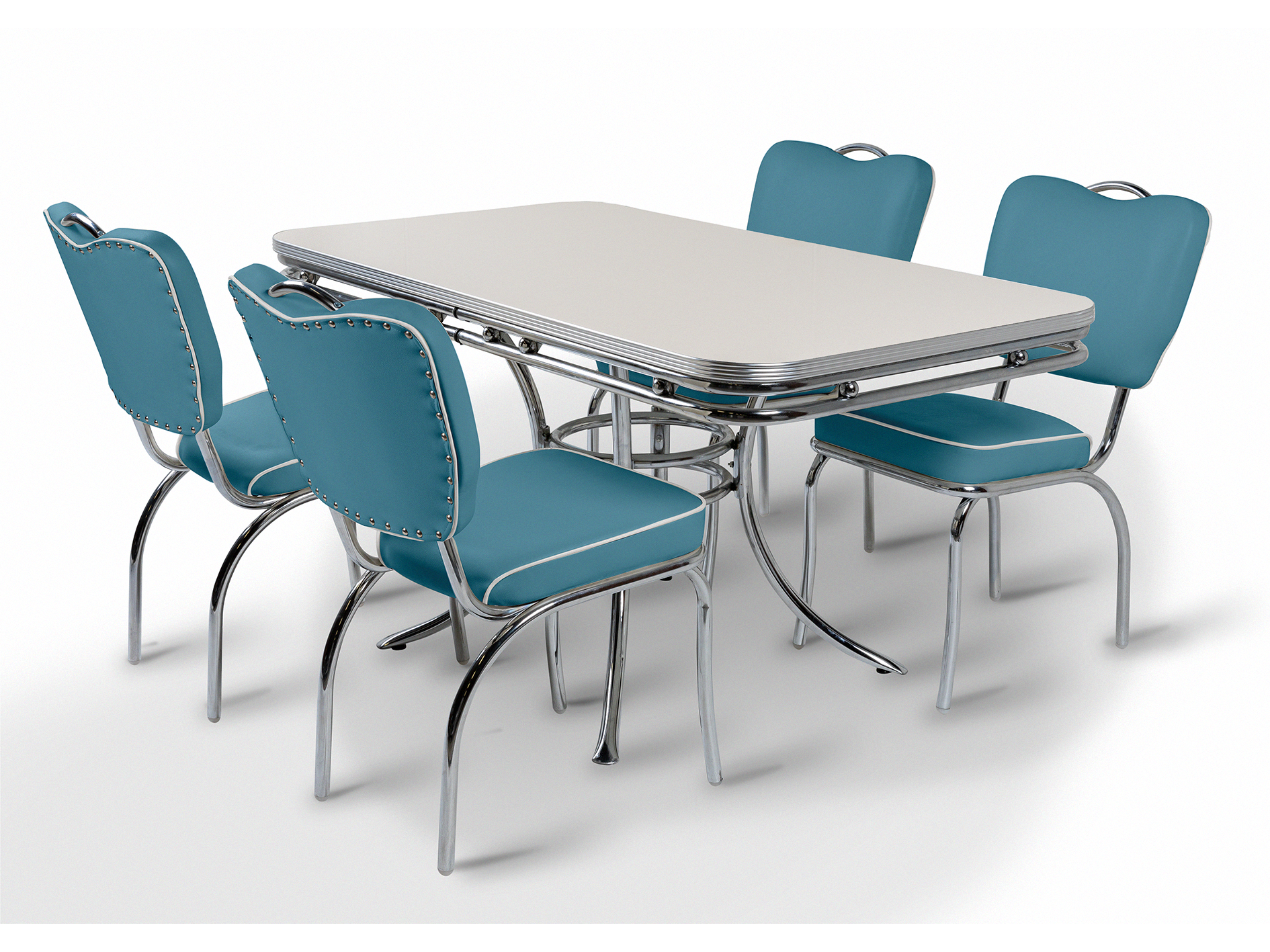 La table en oxyde blanc est la pièce maîtresse de l'ensemble. Son piètement chromé massif et son plateau en Formica résistant, à la finition oxyde brillante, lui confèrent une allure authentique de diner américain. La surface claire met en valeur les détails chromés et crée un style authentique, tandis que le plateau robuste est conçu pour un usage intensif. Idéal pour les cuisines, les restaurants, les bars ou les concepts de diners, cet ensemble est conçu pour être performant et durable.