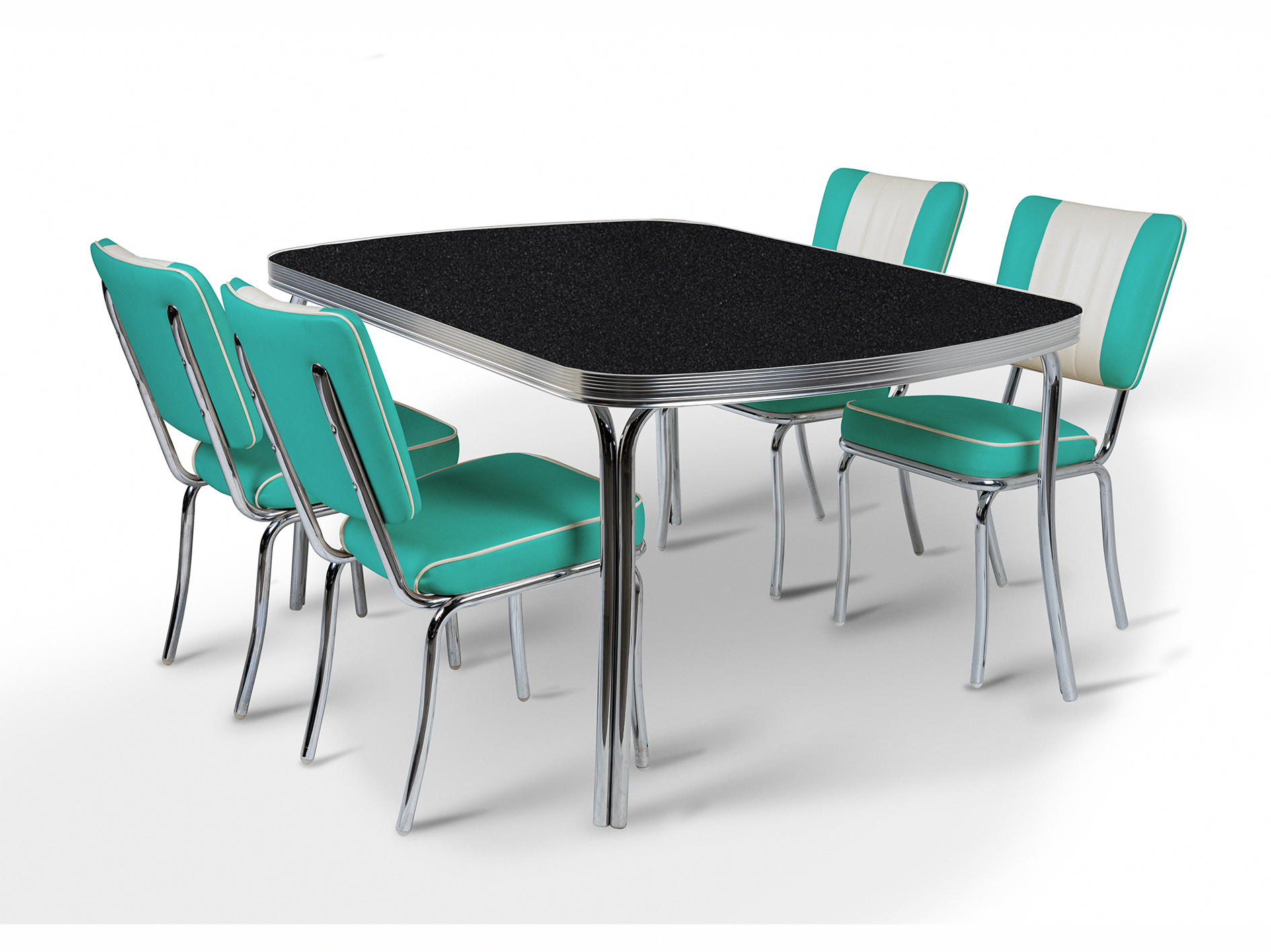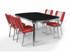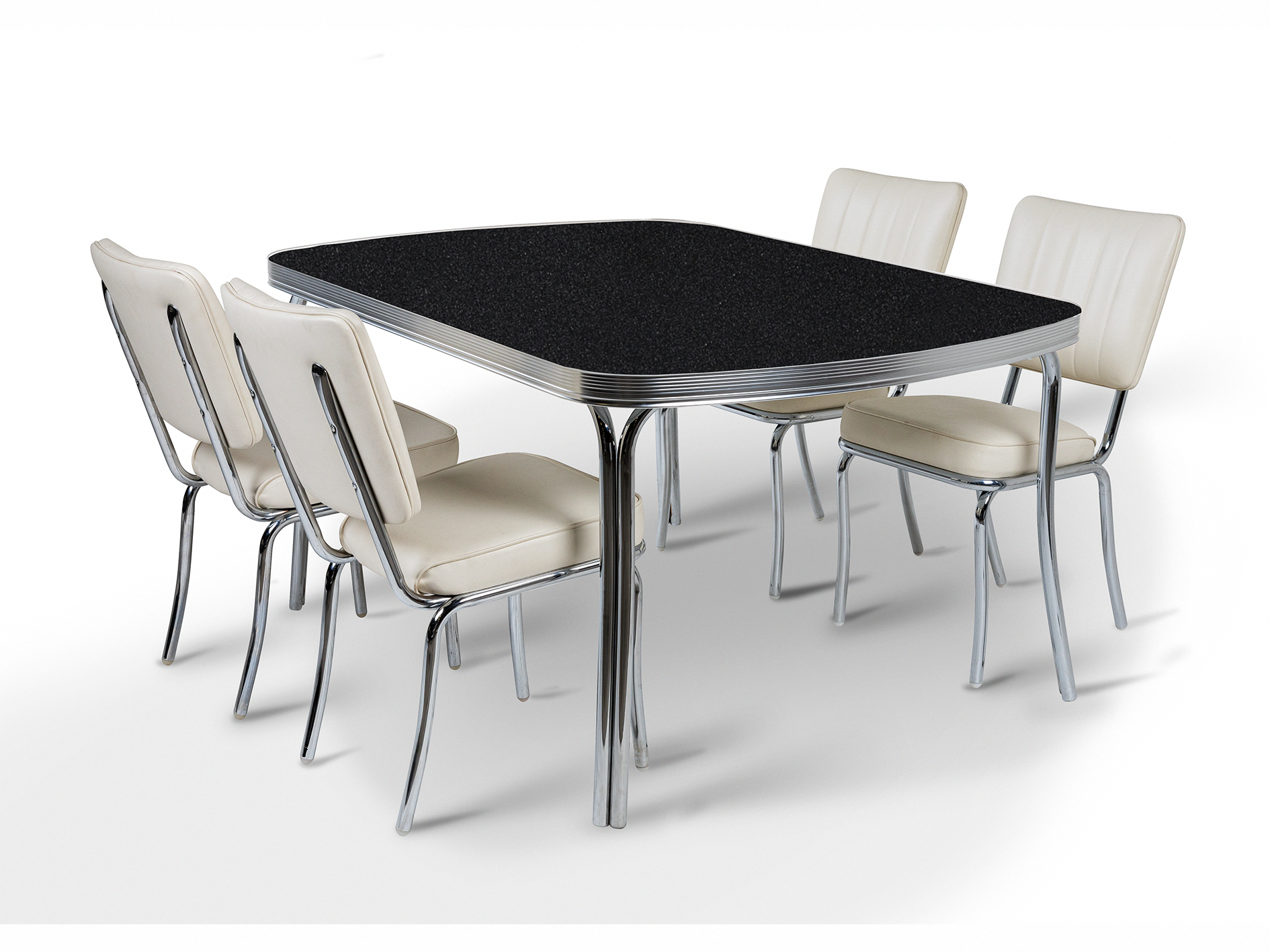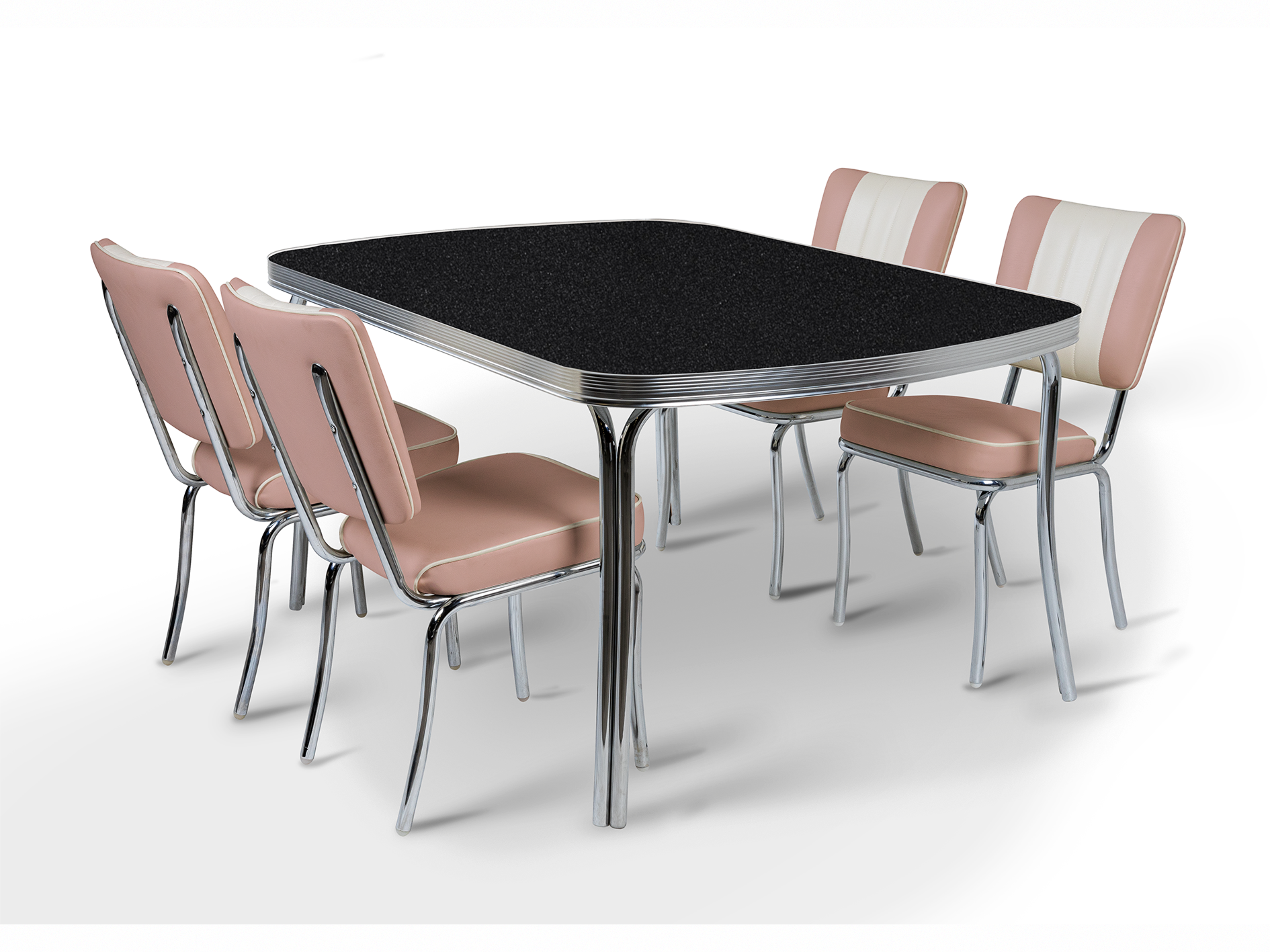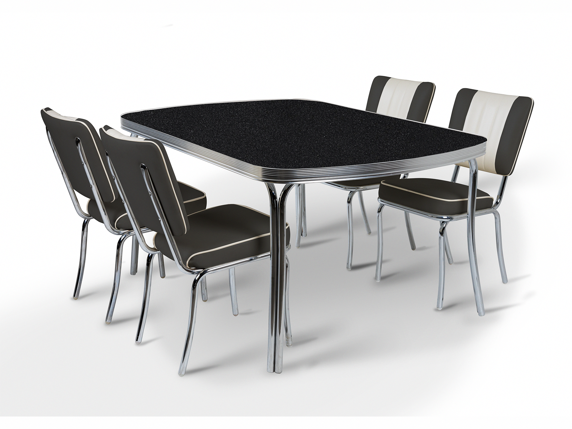 L'ensemble Arcade Black Stone affirme un style audacieux inspiré des années 50 avec sa finition graphique plus sombre. Les chaises Arcade, quant à elles, dégagent un charme vintage affirmé, inspiré du plus ancien restaurant américain de Memphis, dans le Tennessee. Chaque chaise arbore le motif distinctif du dossier à canaux, un rembourrage en similicuir haut de gamme et une structure chromée robuste. Les coutures structurées et les détails chromés polis confèrent aux chaises une présence rétro indéniable, idéale pour un usage quotidien dans les intérieurs résidentiels et commerciaux.