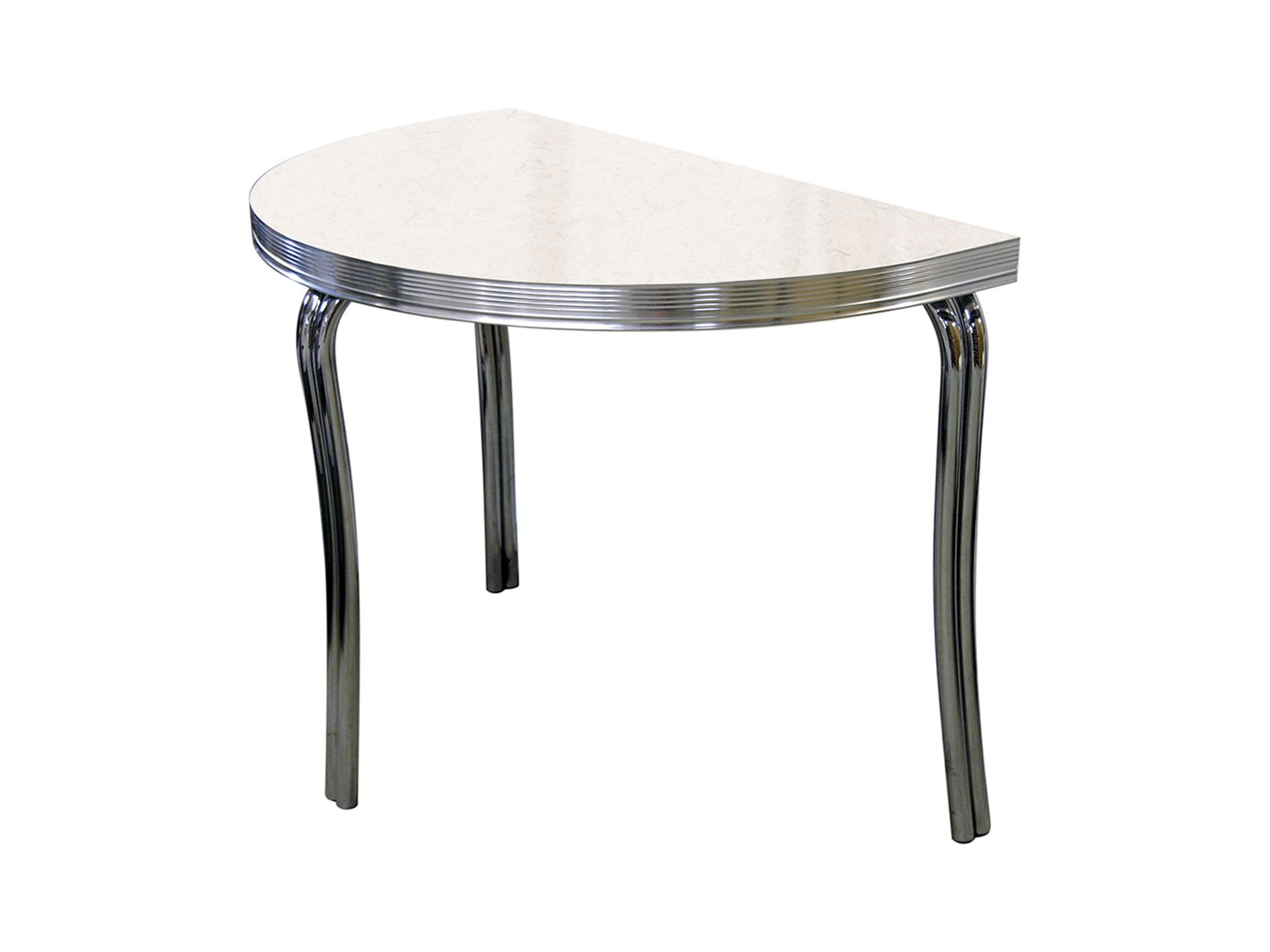 La WO-12 est une table murale demi-ronde conçue pour les espaces réduits. Idéale pour être fixée au mur, elle libère de la place au sol tout en offrant un coin repas confortable. Sa finition aluminium lui confère un charme unique inspiré des années 50, tandis que sa conception robuste évoque le mobilier vintage de cette époque, avec un plateau en Formica ultra-résistant.